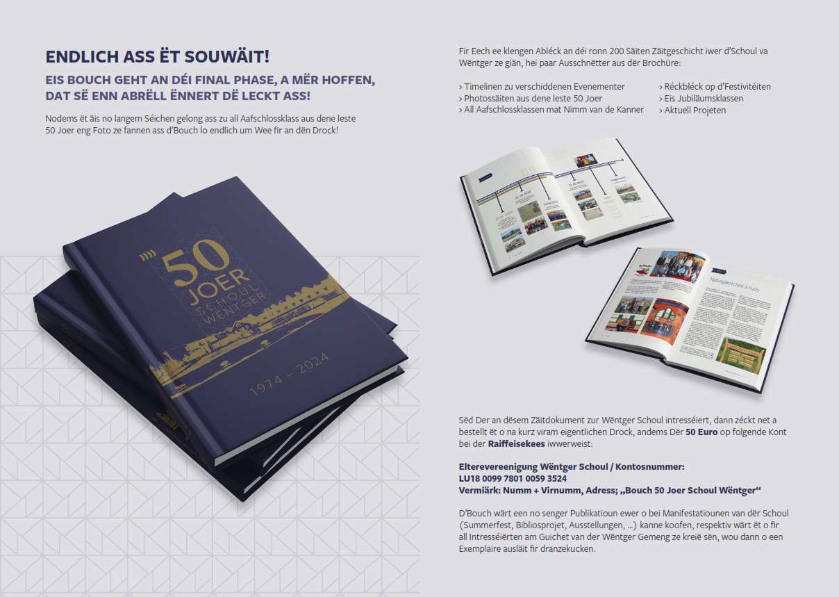 Eist Bouch zu 50 Joer Schoul Wëntger ass am Drock a mër hoffen, dat ët fir eis Béicherdeeg, den 23. a 24. Abrëll fiärdig ass a kann op dër Béicherausstellung presentéiërt, verdeelt a verkooft giän.
